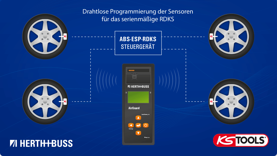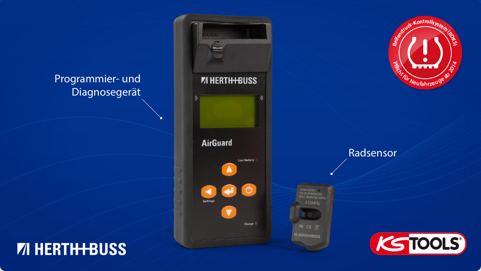 Herth+Buss AirGuard ist ein Programmier- und Diagnosegerät für Reifendruck-Kontrollsysteme (RDKS). Es kann Sensoren duplizieren oder für jedes serienmäßig auf Reifendrucksensoren ausgelegte Fahrzeug programmieren. Die verfügbaren Fahrzeugdaten sind auf dem Gerät installiert und können jederzeit kostenlos über die Herth+Buss-Homepage aktualisiert werden. Eine kabellose Umprogrammierung von aktivierten Sensoren ist ebenso möglich. Als Handheld-Gerät ist AirGuard besonders praktisch nutzen: Laptop, Verkabelung u.s.w. entfallen, da sich die Fahrzeugdatenbank direkt auf dem Gerät befindet.